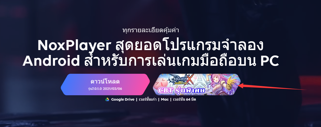 1.ไปเว็บไซต์ทางการ NoxPlayer และดาวน์โหลดรุ่นพิเศษ CBT Ragnarok X: Next Generation หรือคลิกปุ่มดาวน์โหลดโดยตรงเพื่อดาวน์โหลดรุ่นพิเศษ